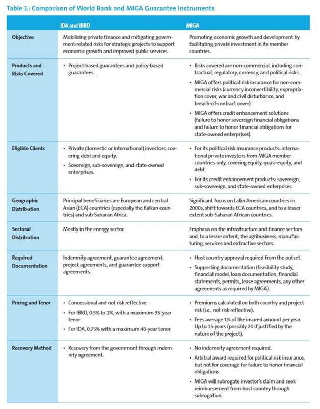 With these advantages and disadvantages in mind, it is important to understand the distinctions among the various development guarantees offered at the major MDBs or MDB groups selected for this article.