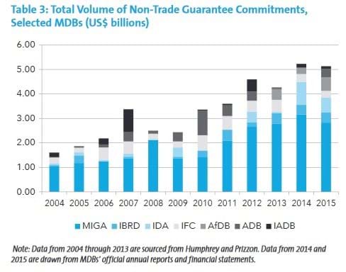 Despite these advantages, guarantees have been significantly underutilized to date compared to other forms of development financing. The MDBs considered in this article approved a total of US$40.17 billion in non-trade project guarantees between 2004 and 2015, which represents 4.4% of the total development financing over that same period.